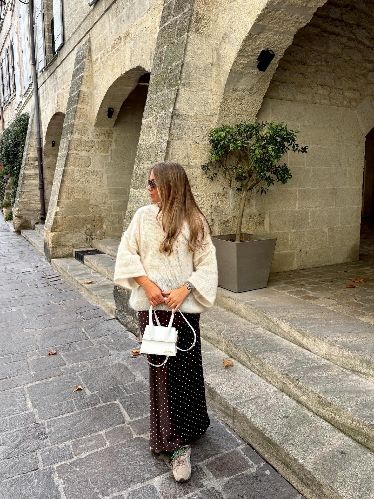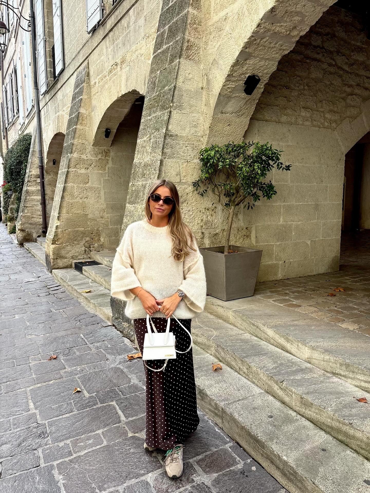 - Jupe satinée marron à pois